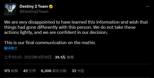 Bungie 补充道:“我们对获悉此消息感到非常失望,并希望这个人的情况有所不同。我们不会轻易采取这些行动,我们对我们的决定非常确信。这是我们就此事的最后一次沟通。”