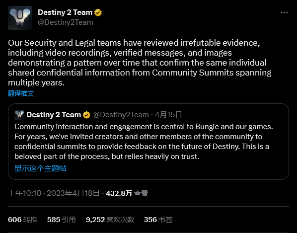 然而事实可能并非如此:Bungie 在表达自己对社区破坏信任感到失望几天之后,发布了一条新的推文,表示这位主播就是泄露者的证据确凿。在新推文中《命运2》开发团队表示:“我们的安全和法律团队审查了无可辩驳的证据,包括视频记录、经过验证的消息和图像,这些证据表明随着时间的推移,同一个人在多年的社区峰会上多次共享了机密信息。”