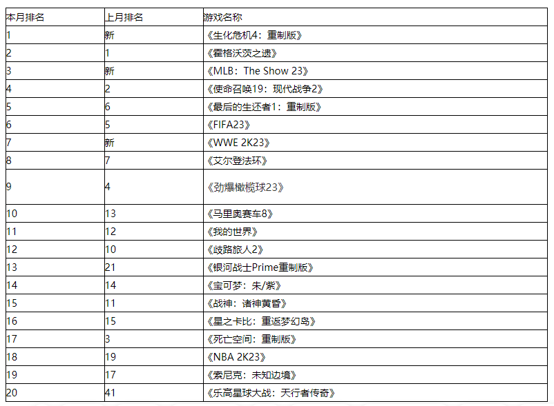 卡普空的《生化危机4:重制版》于 3 月首次亮相,成为游戏销量排行榜之首。与此同时,华纳兄弟的《霍格沃茨遗产》排名第二,而索尼的《MLB:The Show 23》首发成为本月第三大畅销作品。