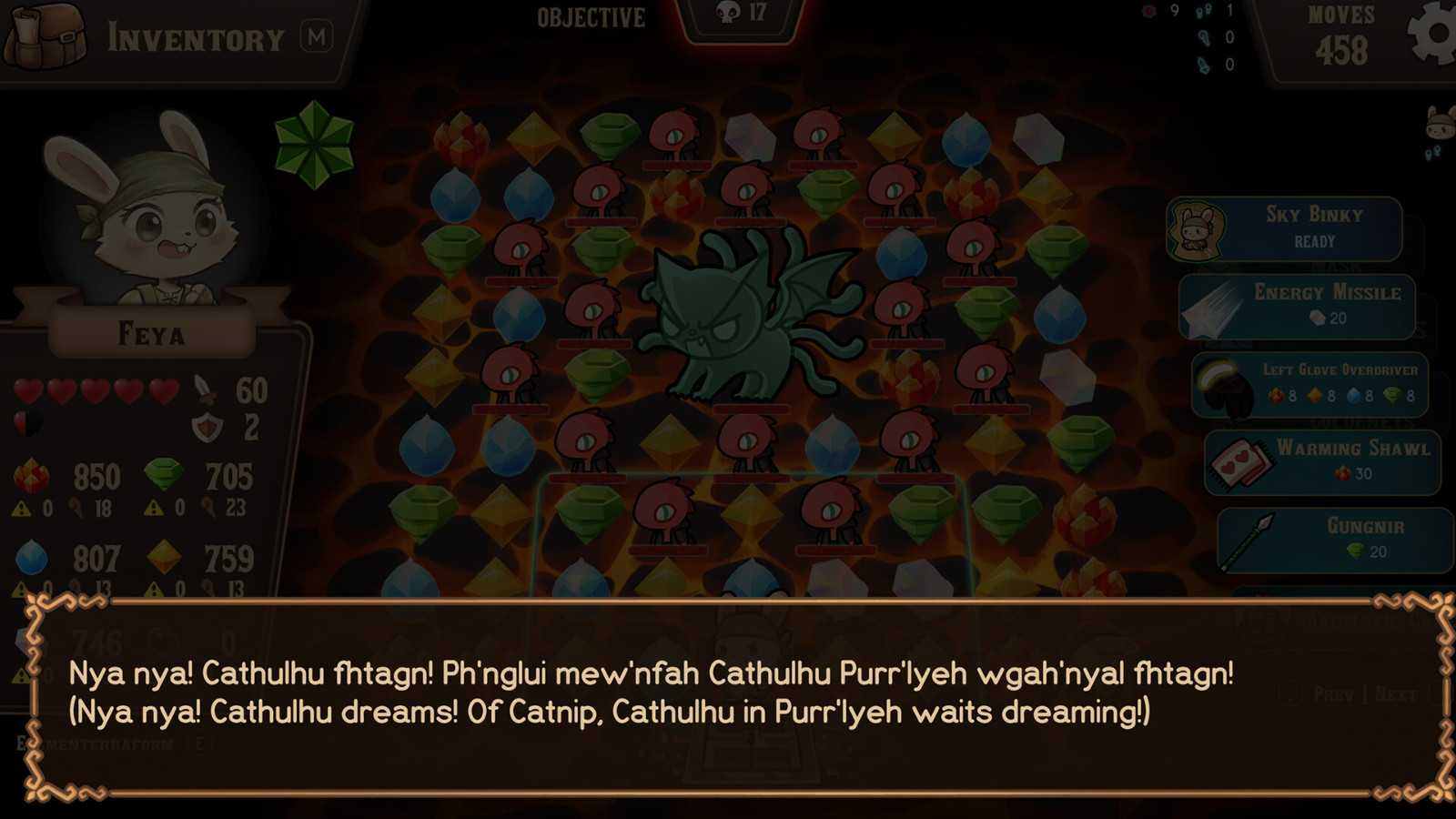 游戏采用元素魔能三消系统,你能控制城堡随处可见的原生魔能。六种特殊的消除能力任你选择,改变游戏的玩法。利用时间道具停住时间,定住敌人,或者利用百搭魔能,成为连消大师。召唤可以发射能量的猫猫,或者炸掉魔能,引发连环爆炸!