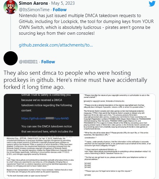 有用户发现任天堂此次清理范畴似乎并不局限于《王国之泪》相关内容。任天堂对GitHub发起了多项基于DMCA(数字版权千年法案)的下架请求,一些与Switch相关的软件工具遭下架,热门工具Lockpick或也将下架。