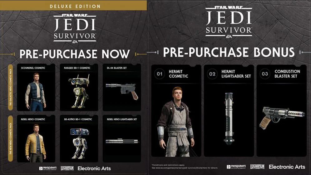 预购奖励包括一套“隐士”外观和光剑套装,让玩家可以将主角打扮的像《欧比旺》美剧中的绝地大师一样,以及一套燃烧枪套装。豪华升级包则包含两套外观,一套灵感来自汉·索罗,另一套灵感则来自卢克·天行者。
