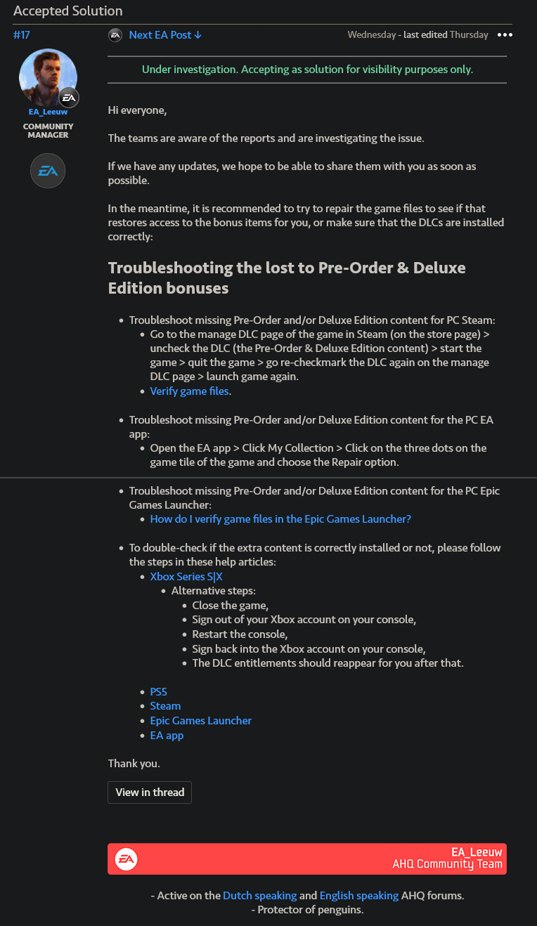 EA 的一位社区经理表示团队“知道这些报告并正在调查这个问题”。EA 建议“尝试修复游戏文件,看看是否可以回复对额外项目的访问,或者确保正确安装 DLC”。