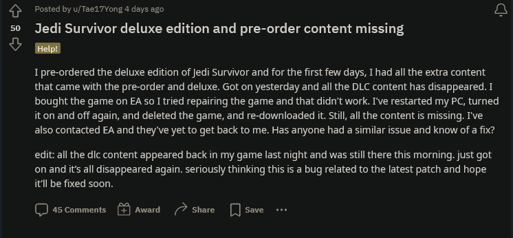 Reddit 用户 Tae17Yong 写道:“我与够了《绝地:幸存者》的豪华版,在最初的几天里,我获得了所有额外的内容。昨天开始,所有 DLC 内容都消失了。我在 EA(应用)上买了游戏,我尝试了修复游戏但没有用。我重新启动了 PC,再次重新打开游戏,删除游戏重新下载。仍然,所有内容都失踪了。”