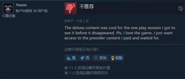 随后一段时间这些“失踪”的物品突然出现,然后又消失了。许多玩家在游戏 DLC 的 Steam 评论中报告了相同的问题。