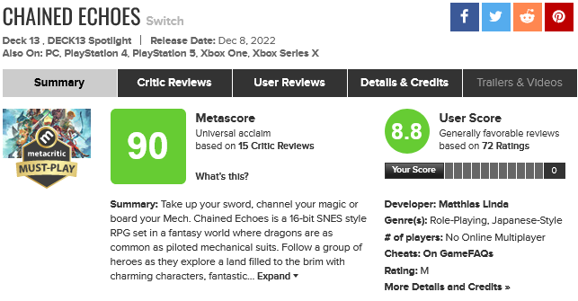 在最近的一条推文中,发行商 Deck13 的产品负责人 Michael Hoss 特别列出了一系列用户针对《链接回声》的负面评论。他表示游戏在推出后在 Metacritic 上获得了 90 分的高分以及“必玩作品”的徽章。但在最近吉田,Switch、PC 和 PS4 版本的 M 站评分突然收到大量负面用户评分,导致用户评分变为 5 到 6 分左右。