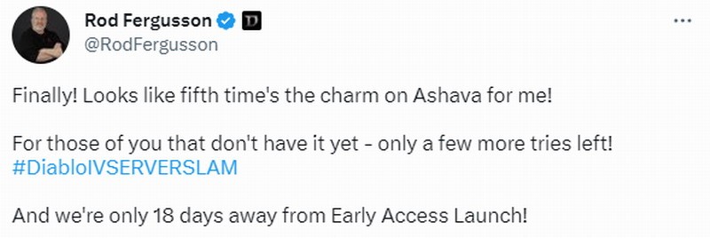 《暗黑破坏神4》服务器压力测试目前已经结束了,游戏的负责人Rod Fergusson为了击败令人生畏的世界Boss,也是费劲了功夫,在本次测试中Fergusson使用了德鲁伊挑战了五次BOSS才最终将其击败获得胜利。