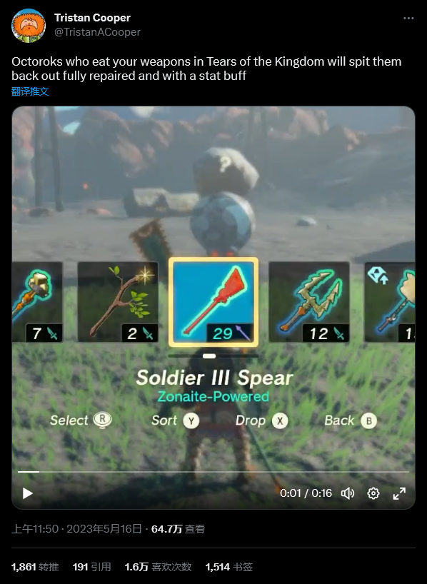 在《王国之泪》中,所有武器都因为腐蚀而变得非常易碎。这导致许多玩家都畏惧使用一些他们喜爱的武器,就和我一样经常因为强力的武器即将损坏而头疼。这时候玩家就可以去寻找那些岩石章鱼怪。