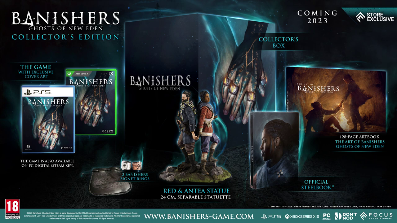 在预告中,官方还宣布了典藏版。典藏版将包括游戏本体、游戏两位主角可拆分的高达 24 厘米的雕像、官方实体艺术集、金属收纳盒(Steelbook)、一对驱灵者标志戒指,以及预购所附带的游戏内套装 DLC。