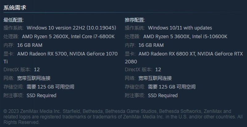 B社还公布了《星空》PC配置需求,最低需要GeForce 1070 Ti/AMD Radeon RX 5700;推荐使用GeForce RTX 2080,需要125GB存储空间。