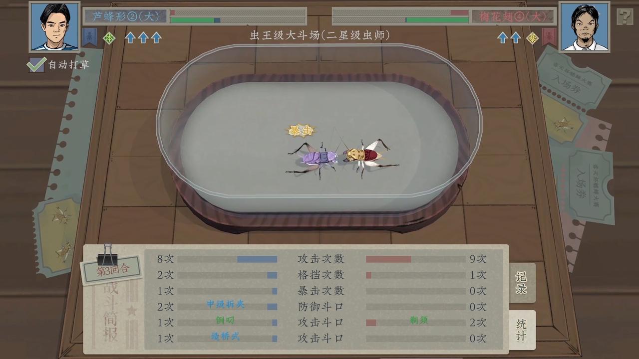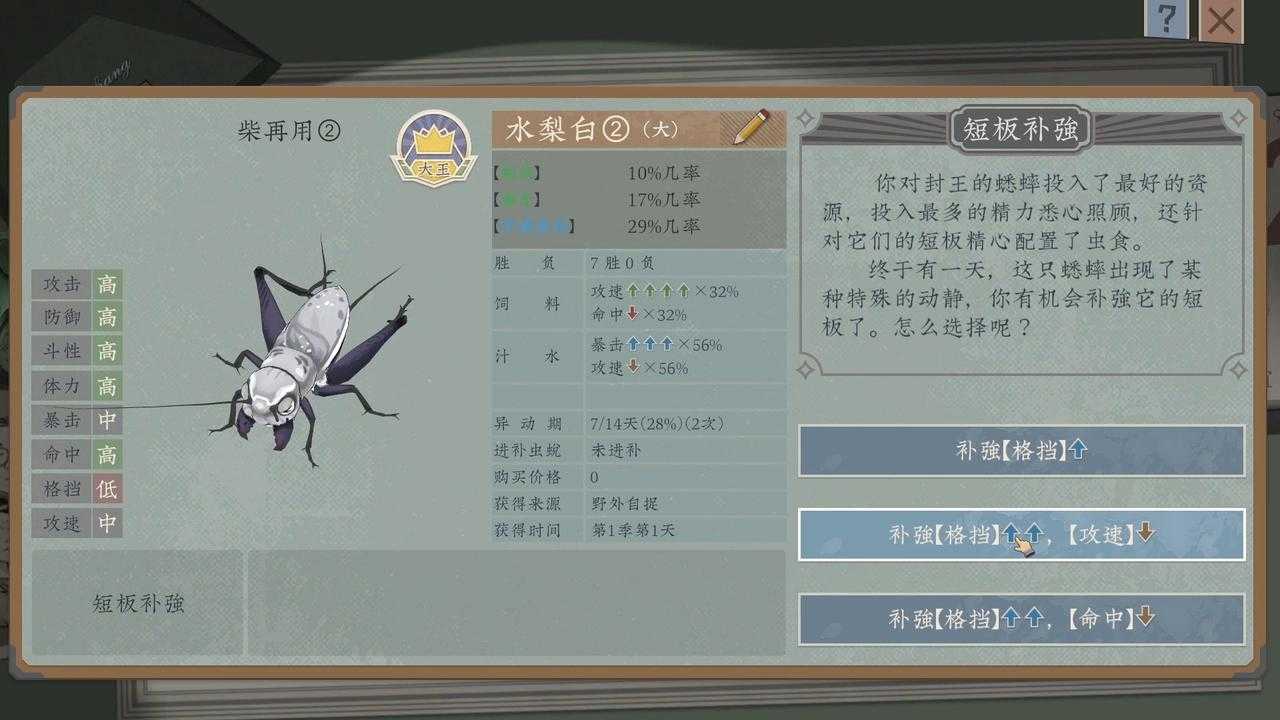 没有两只属性相同的蟋蟀,也没有两只长相一致的蟋蟀。有些蟋蟀触须断了一截,有些两条尾巴都秃了,有些甚至少了一条大腿……游戏不会直接告诉你蟋蟀属性的具体数值,但会指明大致的范围并提供对比。另外,你可以通过360度旋转来观察蟋蟀,根据其长相和数值面板来估算它的强弱,比如翅膀越长斗性越强......
