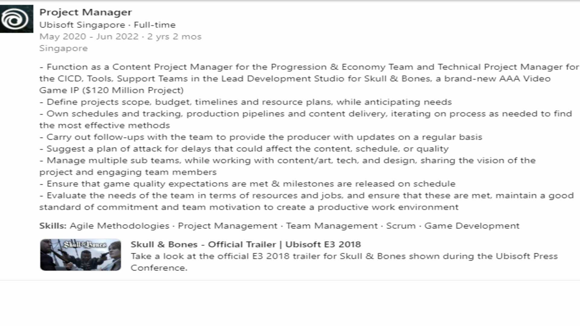 在《碧海黑帆》的前项目经理的简历中写道:“《碧海黑帆》的主要开发工作室支持团队,这是一个全新的3A游戏IP(1.2亿美元的项目)”。Kotaku的报道是在2021年发布的,而这个项目经理是在2022年离职的,考虑到《碧海黑帆》的开发仍在继续,所以该作的开发成本可能会进一步增加。