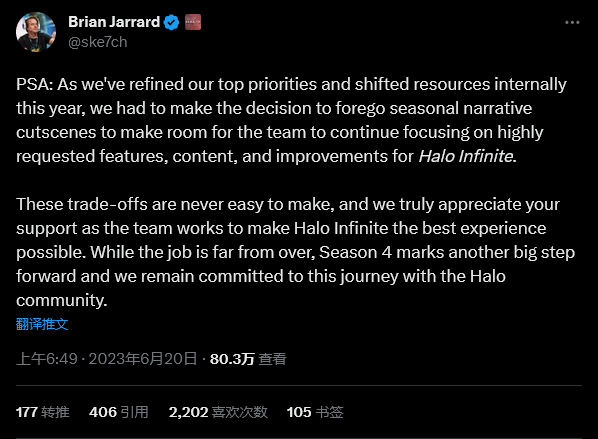 《光环》社区总监 Brian Jarrard 近日在推特上表示,《光环:无限》即将从第4赛季取消赛季过场动画,具他所说这是为了将资源转移到更加重要的地方,比如玩家高度要求的功能、内容和改进。