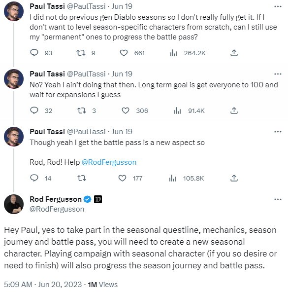 一位玩家在推特上询问Fergusson:“如果不创建赛季角色,是否能用非赛季角色推进战斗通行证进度”。对此Fergusson表示,非赛季角色无法推进战斗通行证进度。玩家必须新建赛季角色,才能游玩赛季内容。