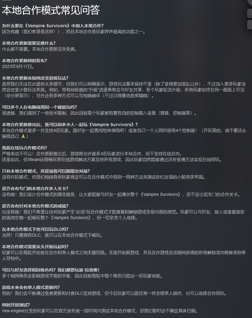 《吸血鬼幸存者》作为一款由Poncle独立开发发行的热门像素肉鸽割草游戏,目前将会在8月17日推出一个免费的更新,本次更新将会添加一个最多4人的本地合作模式,预计上线PC、Xbox 和任天堂 Switch平台,游戏会在更新的时候上线Switch平台。