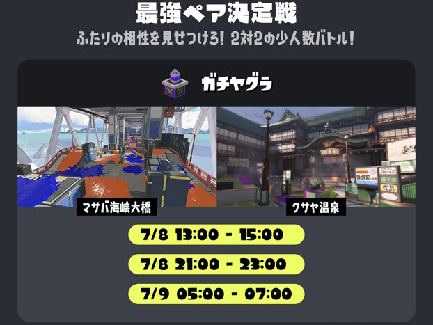 本次的最强双人战官方大赛并非平时的4V4混战,而是采取2V2的少人数战斗,游戏规则为抢塔模式,地图选定为MASABA海峡大桥与KUSAYA温泉,特殊规则是复活时间缩短,挑战你与队友的配合吧。