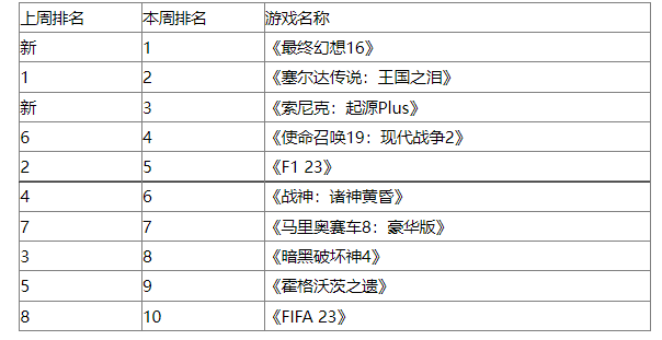 以下为英国 GfK 截至 2023 年 6 月 24 日一周游戏实体销量排行前十名:
