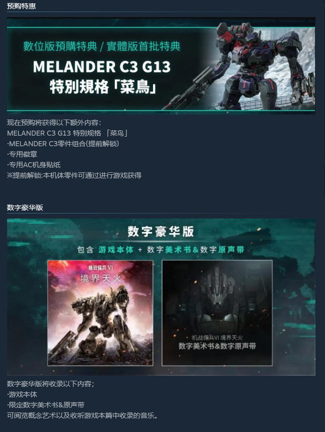 《装甲核心6:境界天火》将于 2023 年 8 月 25 日发售,目前游戏已开放预购,上架 Steam,国区售价 298 元,数字豪华版售价 348 元。预购可获得特别规格机甲、零件、专用徽章和机身贴纸;豪华版则包括游戏本体和游戏的数字艺术集+原声带。游戏支持简体中文。