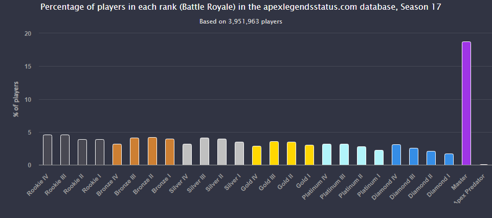 《Apex英雄》在这次的17赛季的数据显示,游戏现已有约20%(18.647)玩家达到大师级别,虽然这个数据令人很惊讶,但是主要还是因为赛季的机制问题导致很多水平不足的玩家可以通过避战混到分。