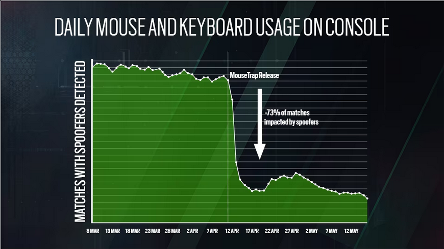 MouseTrap 是育碧打击那些在主机上想要通过使用键鼠来获得不公平优势的玩家的方式。该检测系统于今年 4 月 11 日推出。育碧透露,自系统推出以来,主机上使用键鼠游玩《彩六:围攻》的用户数量减少了 78%。而在排位比赛中减少了 73%。这比育碧当初预期的 30% 至 50% 要高。