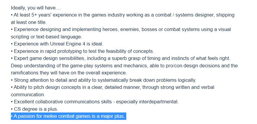 除了其他工作,重生还为游戏招聘一名高级战斗设计师,强调近身战斗。