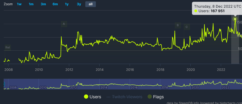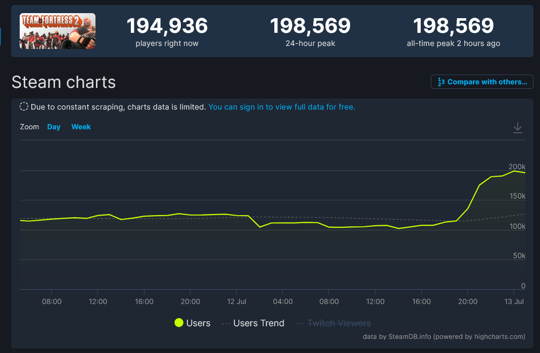在夏季更新上线后,根据 SteamDB 数据统计显示,《军团要塞2》的同时游玩玩家数量创下了这部游戏的历史新高。此前游戏并发玩家最多为 16.7 万人,目前已增至 19.8 万人,且截至稿前,玩家人数依然居高不下,为 19.4 万人。
