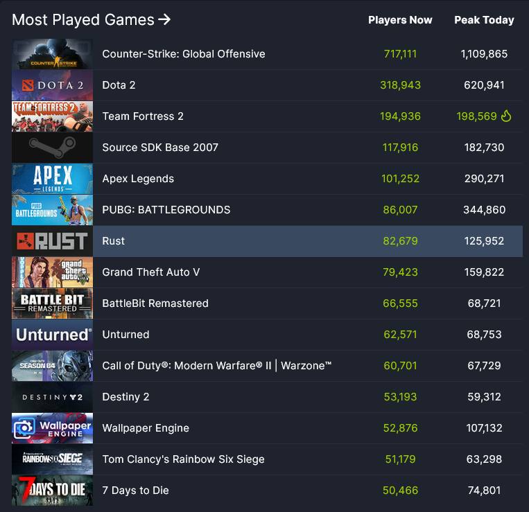 目前《军团要塞2》是 Steam 上在线玩家人数第 3 多的游戏,仅次于 V 社的《CS:GO》和《DOTA2》。