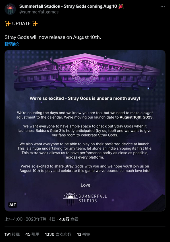 由于这段时间会有很多大作进行发布,为了避免和《星空》撞车,《博德之门3》进行了反向跳票,打算提前发售来让游戏具备一定的关注度,而《迷失神祇:角色扮演音乐剧》开发商 Summerfall 工作室在近日宣布因为《博德之门3》要发布因此将自家的游戏延后到8月10日发售,可谓是起了连锁反应。