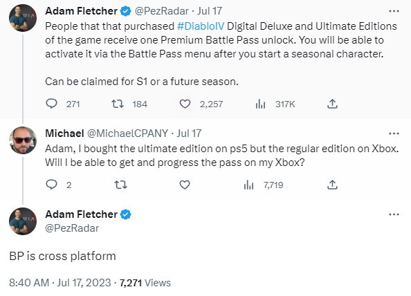 《暗黑破坏神4》全球社区发展总监Adam Fletcher最近在推特上针对网友的提问进行了回答,他现在确定《暗黑4》通行证是可以跨平台的,具体的信息感兴趣的玩家可以了解一下。
