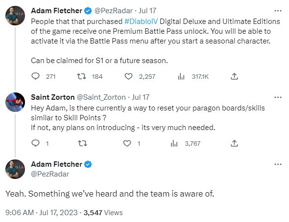 网友Saint Zorton询问:“目前有类似于重置典范面板(Paragon Boards)/技能的方法吗?”