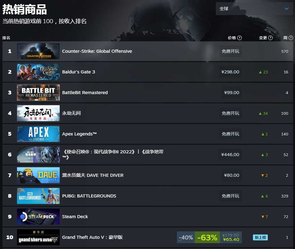 在《博德之门3》之后是《BattleBit:复刻版》《使命召唤19:现代战争2》《潜水员戴夫》。《永劫无间》免费后,位居最热门免费游戏第二名,也是很厉害了。