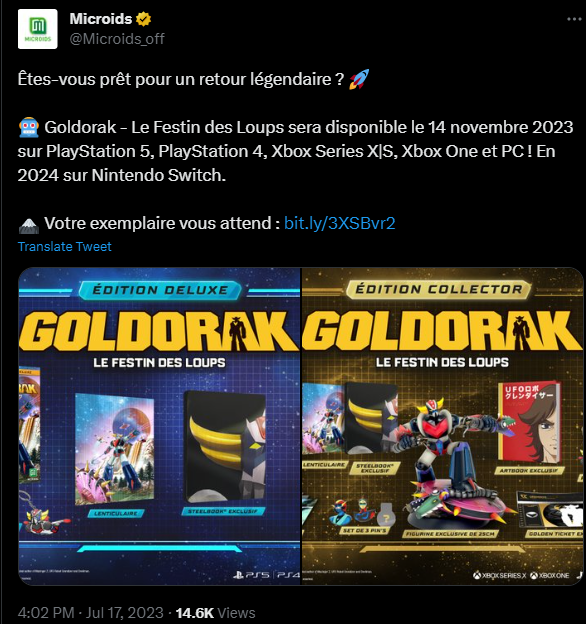 《UFO魔神古兰戴萨:狼之盛宴》是一款由永井豪名作改编的机器人动作游戏,该作的发行商Microids宣布游戏将会在11月14日上线PS4、PS5、Xbox One、Xbox Series X|S、PC平台,游戏的Switch版本会在2024年发售,感兴趣的玩家可以了解一下。