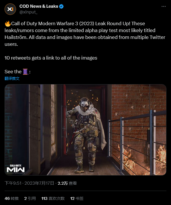 动视尚未正式公布系列新作,但最新泄密者被要求版权删除的通知截图中,动视官方写道泄密者公开的信息包含“未发布的电子游戏《使命召唤:现代战争3》中泄露的内容”。