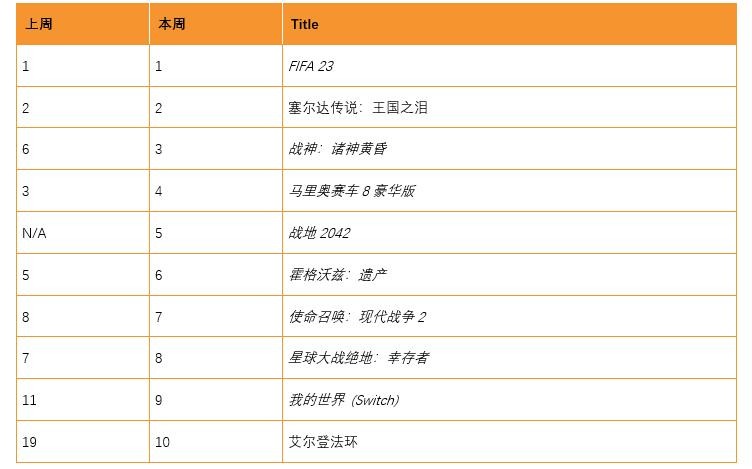 本周英国实体零售排行榜已经正式更新,这次EA Sports 的《FIFA 23》在一次占据了榜单的第一名,游戏的销量增加了6%,而《塞尔达传说:王国之泪》位居第二,DICE 的《战地2042》经过一段时间后重新进入了榜单,排名第五。