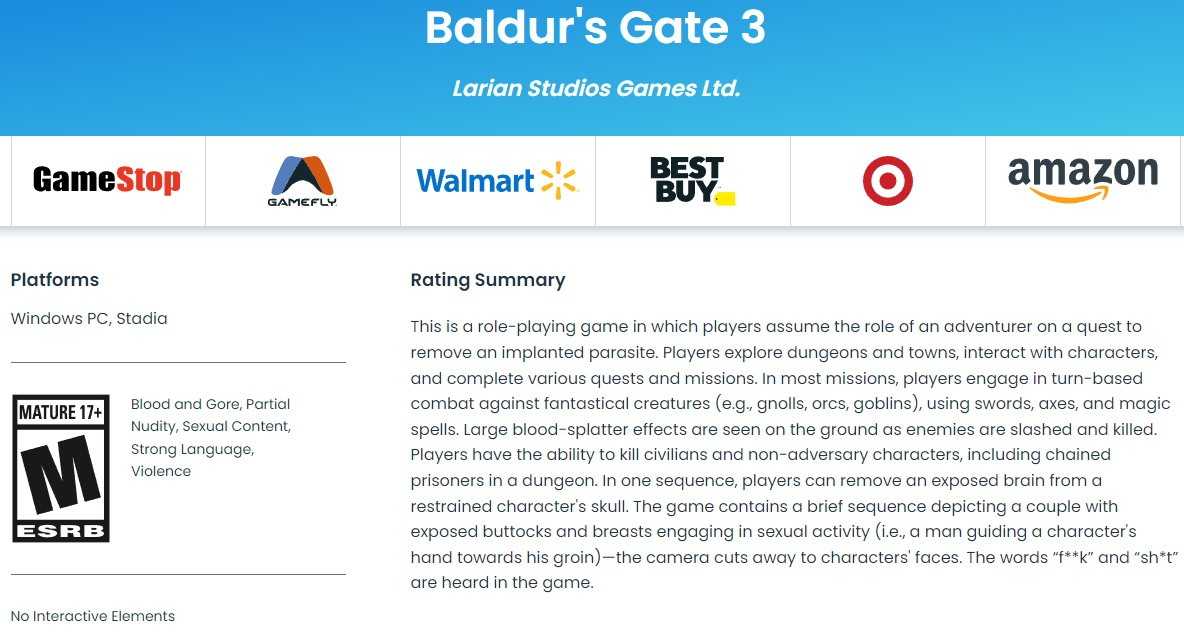 《博德之门3》近日有消息透露,ESRB评级机构对《博德之门3》的评级为“M”成人级,游戏中包含了血腥暴力场面,还有裸体和性内容等,对于玩家来说这些内容应该更能刺激玩家尝试一下该作。