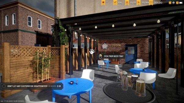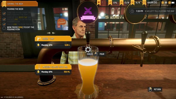 将每天酿造的啤酒出售给顾客,从换酒桶、倒啤酒、洗酒杯、到收拾垃圾一开始都需要自己亲力亲为。而经营一间酒吧并不是一件简单的事情,不同的顾客对口味有着不同的需求,这时候各种风味的啤酒就派上用场了。根据顾客的口味提供对应的饮品,吸引新顾客并保持老顾客的满意度,为自己赚取财富和名誉。