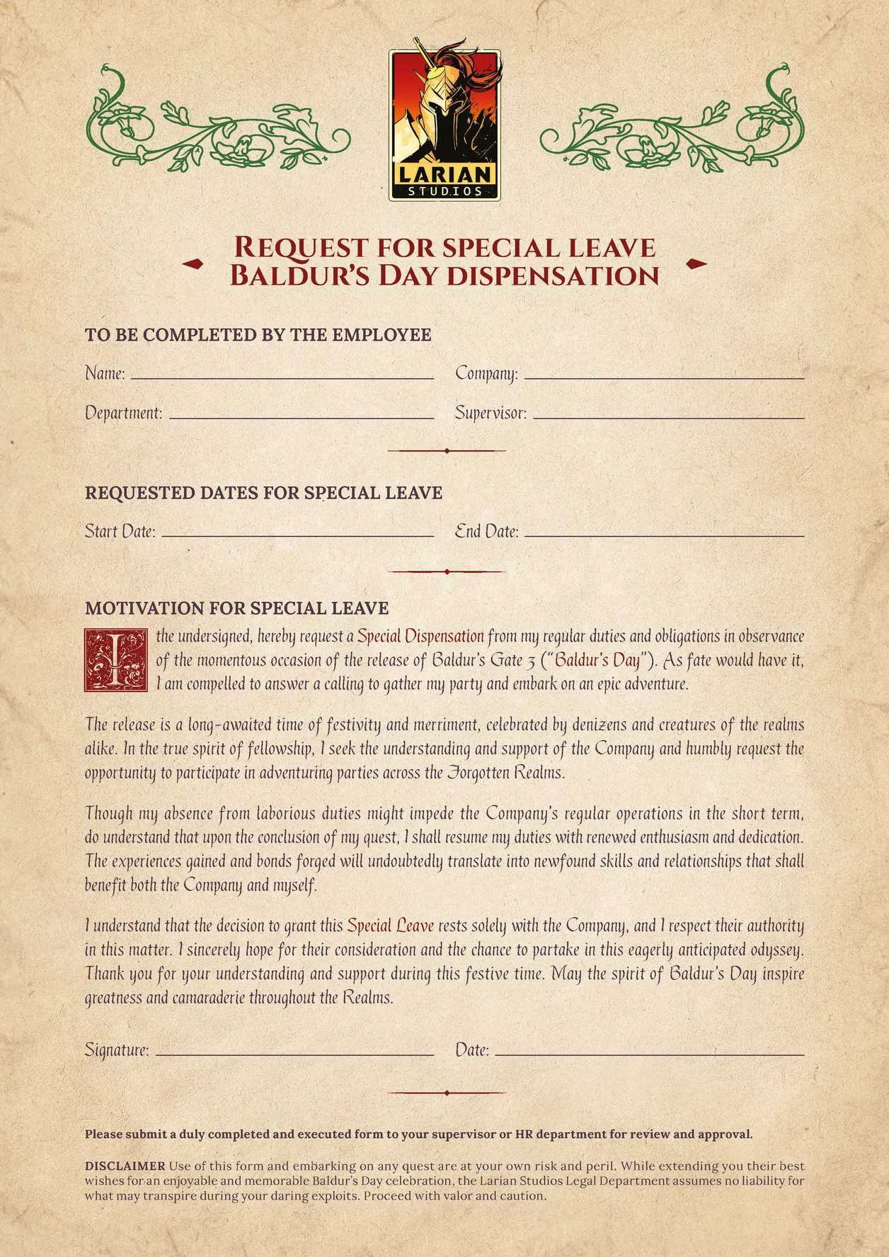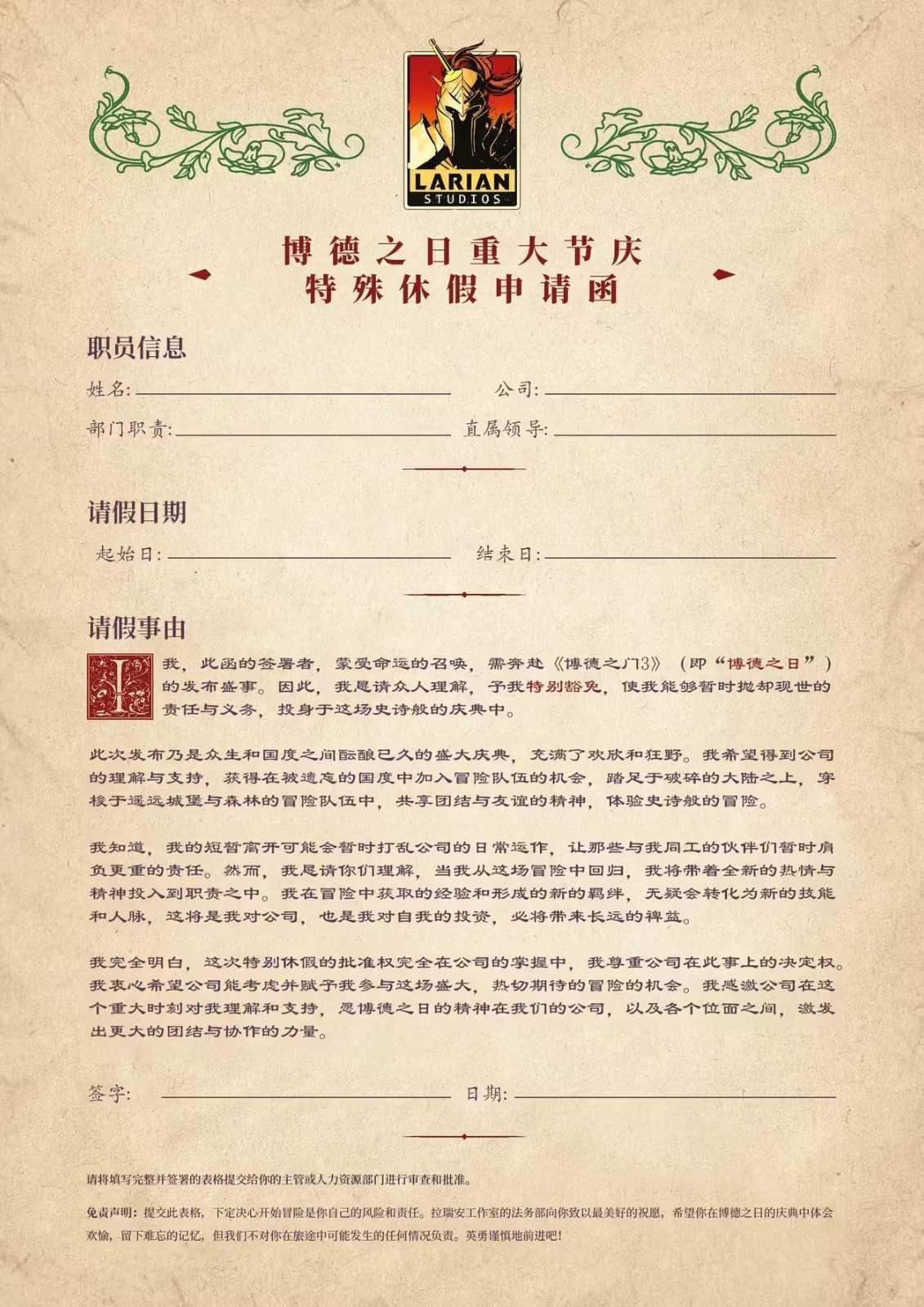 今日,拉瑞安官方公布了游戏《博德之门3》PC正式版的全球解锁时间,目前国内玩家能够在北京时间的8月3日晚上11点开始游戏,不过抢先体验版的存档无法继承到正式版,同时官方为玩家制作了请假条,感兴趣的玩家可以了解一下。