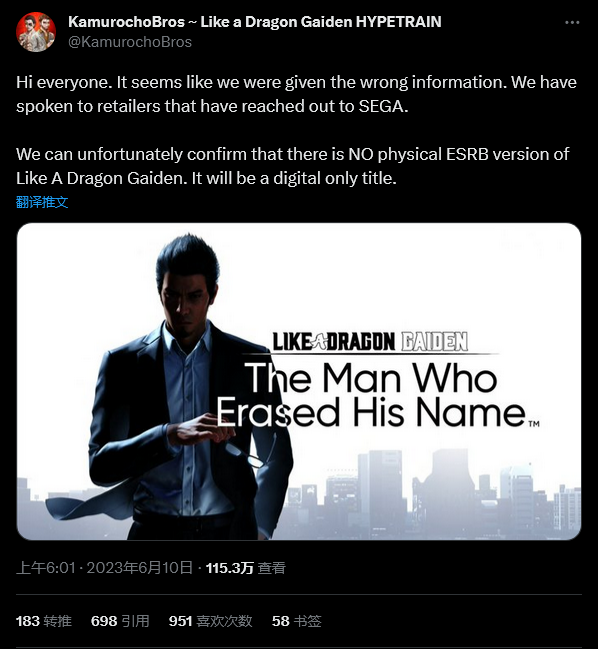 报道称,昨天(7 月 27 日)如龙工作室官方推特发布了一篇推文。虽然看起来只是在宣传游戏将于 11 月 9 日发售的消息,但推文使用了“可供下载”的字眼,因此报道称这侧面证实了此前关于游戏没有实体版的猜测。