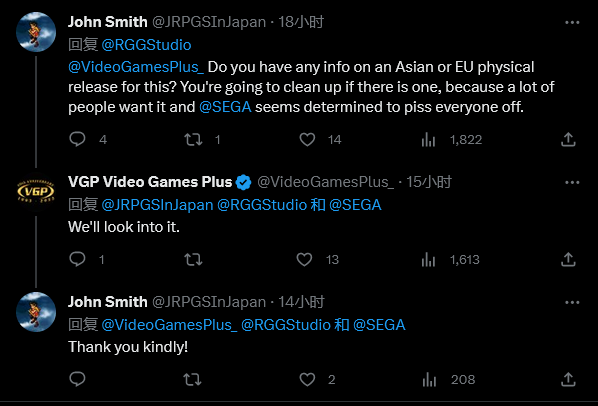 一位玩家询问了加拿大独立游戏零售商 VGP 是否有游戏亚洲或欧洲实体版发布的消息,并希望零售商能够澄清消息,因为许多玩家对于游戏没有实体版感到非常不满。VGP 回应表示将对此进行调查,但是目前暂时没有进一步消息。
