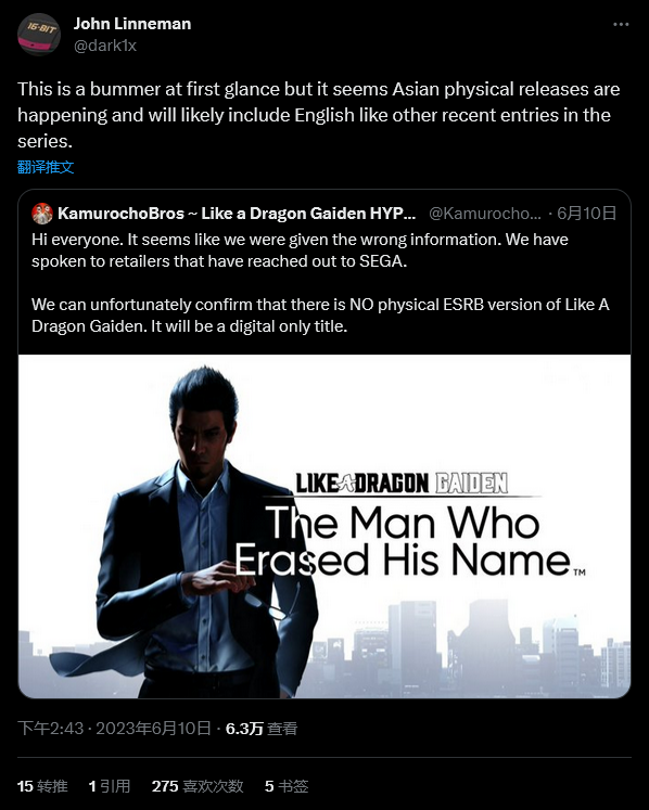 但是据我调查,在这一消息发布后,还有人表示游戏将依然在亚洲地区发布实体光盘。在官方推文下也有类似的评论。但同样,工作室没有对此做出任何回应。