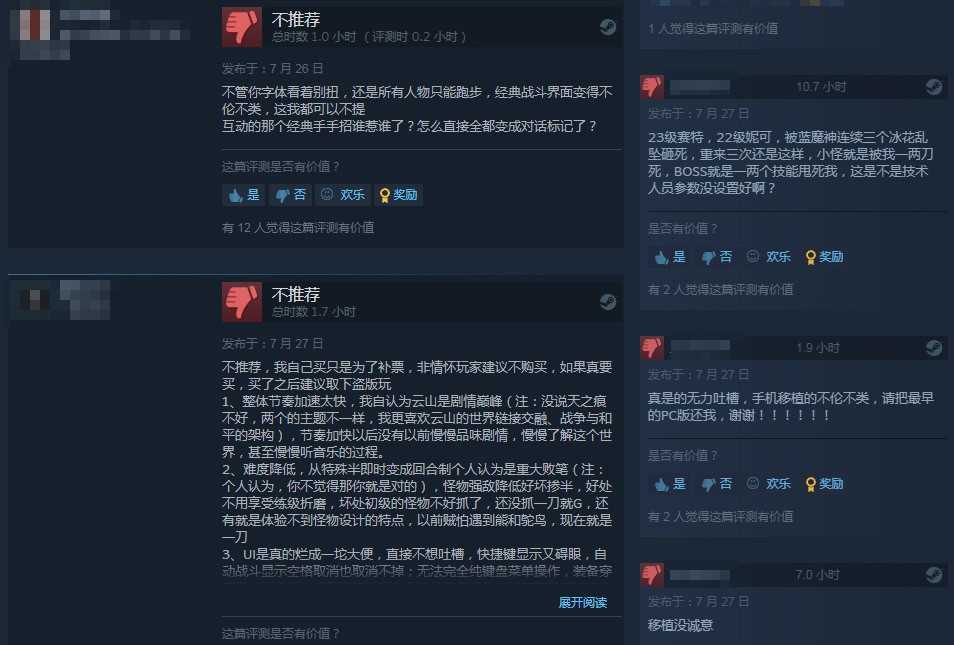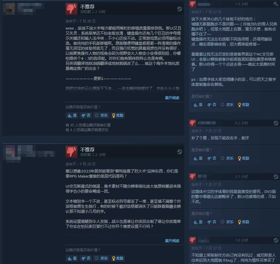给出差评的玩家认为《轩辕剑叁》没有原版运行流畅,还存在很多问题,比如Steam版字体UI效果不如原版、窗口模式大小不能实时调整、原版即时战斗模式没有移植过来、开场动画撒币桥段被删等,同时还出现闪退卡死等情况,真是无力吐槽。
