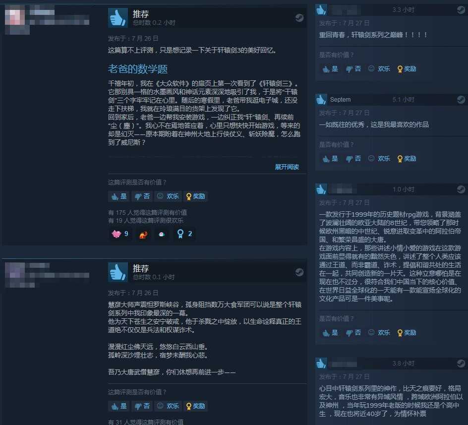 给出好评的玩家表示重回青春,《轩辕剑叁》是轩辕剑系列之巅峰。心目中轩辕剑系列里的神作,比天之痕要好,格局宏大,为情怀补票。