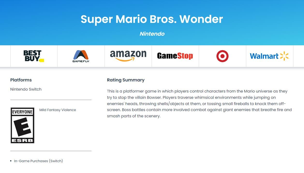 《超级马里奥兄弟:惊奇》目前已经ton过了ESRB评级,游戏的级别是E级,适合全年龄玩家,从评级信息中我们可以了解到游戏包含内购要素,同时该作的大反派还是库巴,游戏预计会在10月20日正式发售,上线Switch平台。