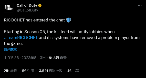 游戏现在在反作弊系统移除一名有问题的玩家后,会立即通过击杀提示通知当前大厅中的所有其他玩家。开发商动视通过《使命召唤》官方推特分享了这一更新,并获得了许多玩家的正面回应。