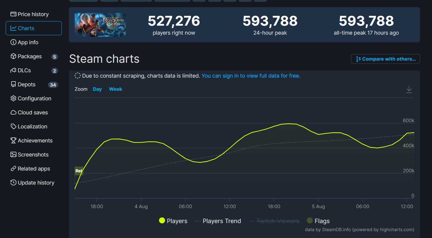 与此同时,随着周末的到来,越来越多的玩家进入到了《博德之门3》游戏中。据SteamDB数据显示,《博德之门3》Steam同时在线达到59.3万,直逼60万,成为2023年Steam首发第二大游戏。第一名为《霍格沃茨之遗》,Steam同时在线88万。