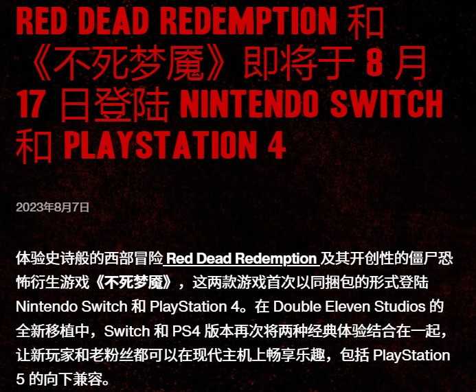 8月17日,深受喜爱的西部体验《荒野大镖客:救赎》及其恐怖衍生游戏《不死梦魇》首次同时登陆Switch和现代PlayStation主机。除了这两款游戏的经典单人体验之外,还首次全新支持包括简体和繁体中文在内的多种语言。