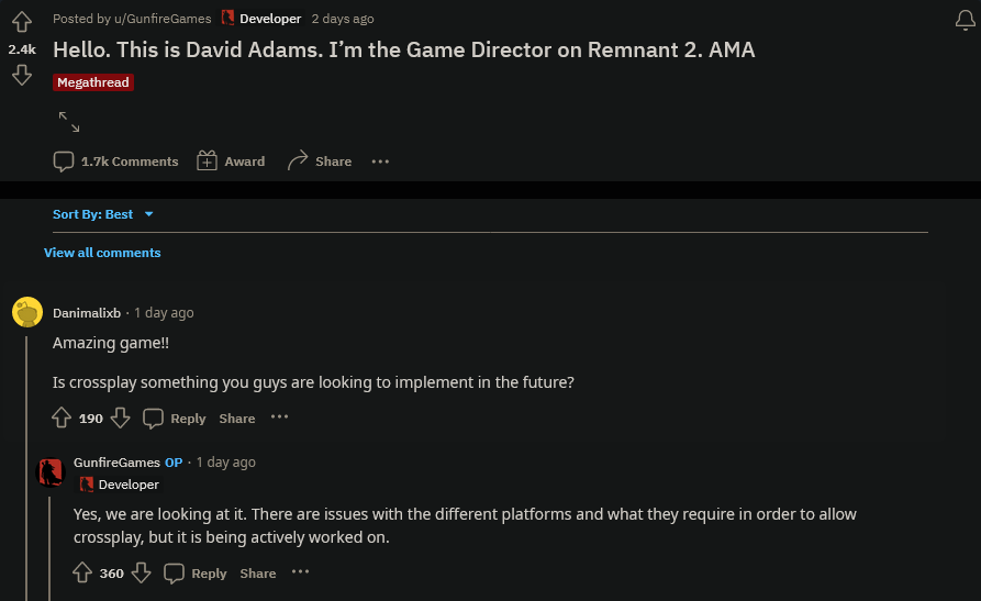 游戏总监兼工作室从才 David Adams 在 Reddit 论坛上的“有问必答”问答环节中分享了这一消息。在被问及《遗迹2》未来是否有可能推出跨平台联机功能时,Admas 解释道:“是的,我们正在考虑这个问题。”