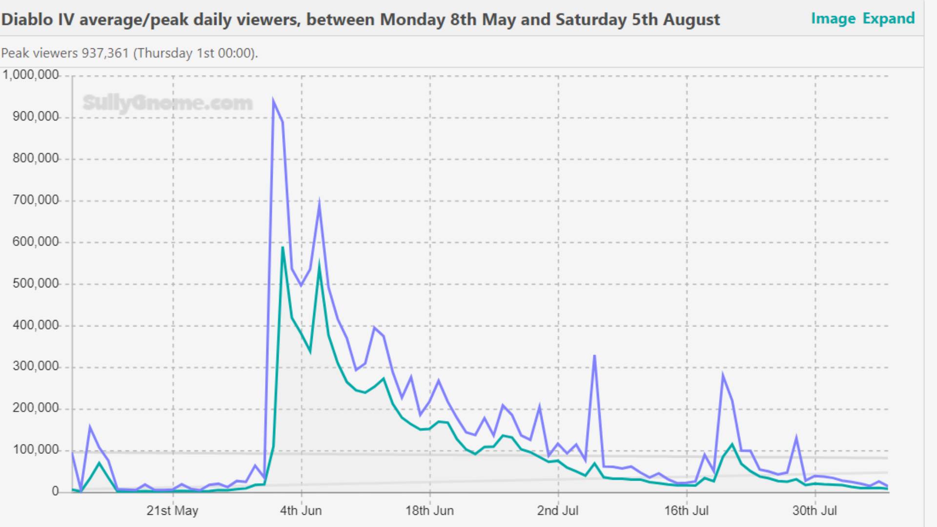 根据直播平台Twitch的数据显示,《暗黑破坏神4》在其抢先体验首日达到了937,361名观众的峰值,然后在正式发布日再次飙升至686,936名观众后,截止到8月7日,该作的Twitch观众数已下降至13,601名。这意味着《暗黑破坏神4》的观众人数在发售两个月后降至了首日的1.45%。