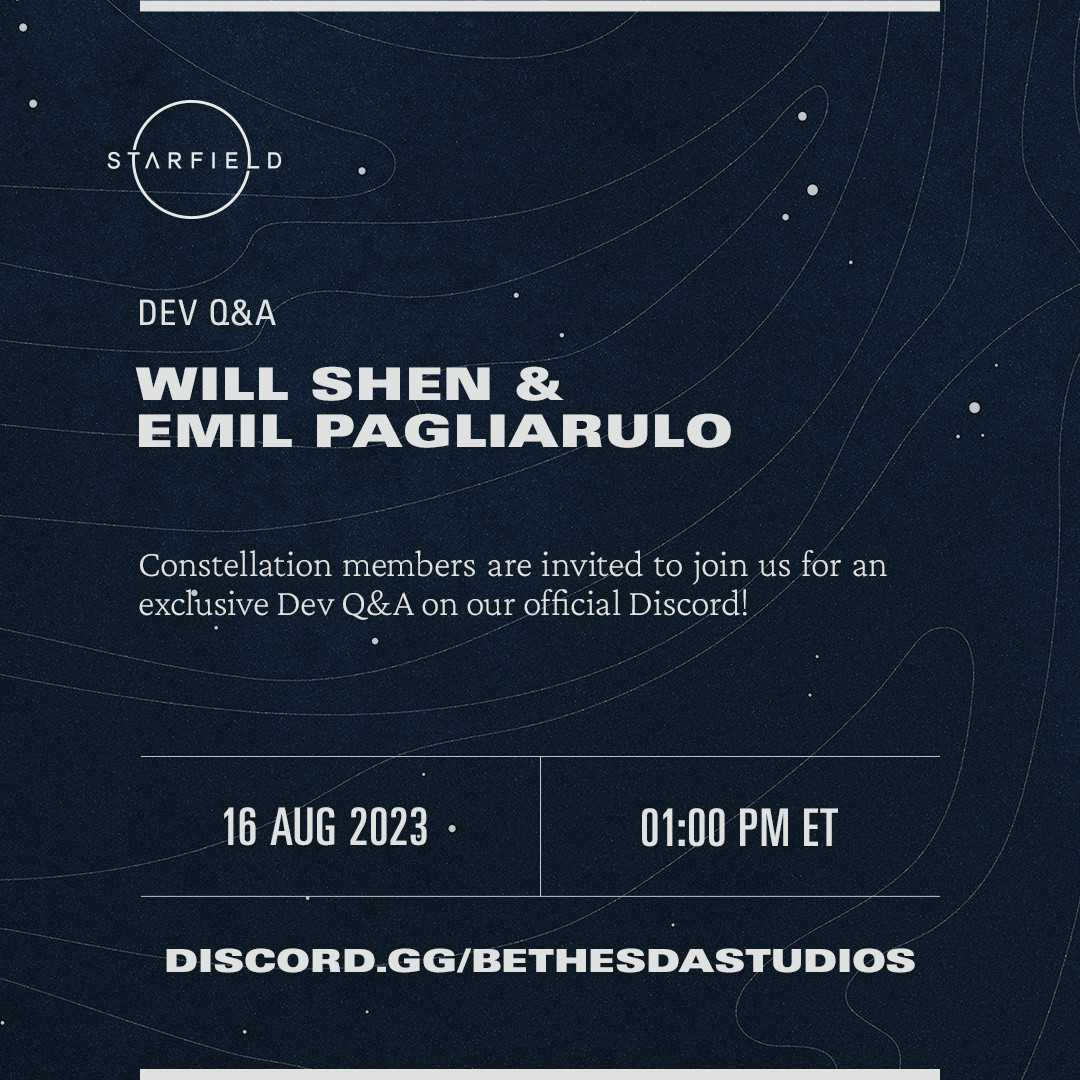 《星空》官方近日发布推文表示游戏将会在8月16日下午14点于Discord频道进行一次开发者问答活动,本次活动期间将会回答一些玩家关心的问题,同时《星空》设计总监Emil Pagliarulo 和首席任务设计师Will Shen将出席本次会议。