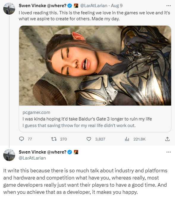 拉瑞安创始人兼游戏总监Swen Vincke发推文称:“我很喜欢这篇文章,其表达的就是我们喜爱的游戏带给我们的感觉,这也是我们渴望为玩家创造的感觉。这让我很开心。”
